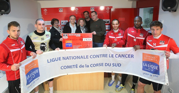 Un chèque de 1900 euros a été remis à la Ligue contre le cancer représentée par le Dr Sauveur Merlenghi, président du comité de Corse-du-Sud, Nicole Spinosi, chargée de communication et Josiane Cariou, chargée de l'action sociale. Le musicien Paul Mancini était également présent: il avait donné le coup d'envoi de la rencontre ACA-Lorient (28e journée) et a été très actif aux côtés de l'association.